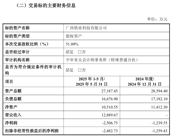 值得注意的是,标的公司2024年尚处于建设期未产生收入,2025年1-5月虽实现营收1.27亿元,但净利润仍为亏损状态。交易对方海南锆钛为此作出业绩承诺,保证标的公司2025-2027年累计净利润不低于6500万元,若交割延期则承诺期顺延至2026-2028年。